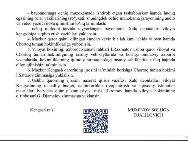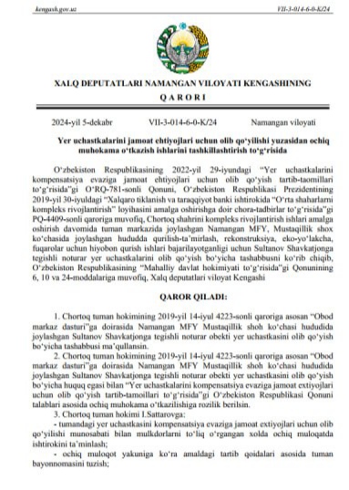 Халқ депутатлари Наманган вилояти Кенгашининг "Ер участкаларини жамоат эҳтиёжлари учун олиб қўйилиши юзасидан очиқ муҳокама ўтказиш ишларини ташкиллаштириш тўғрисида"ги қарори
