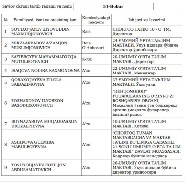 Cайлов ўтказувчи округ сайлов комиссияларининг таркиби