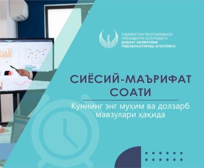 Давлат хизматини ривожлантириш агентлиги томонидан ҳафтанинг ҳар жума куни ташкил этилаётган сиёсий-маърифат соатида Чортоқ тумани ҳокимлиги ходимлари ҳам иштирок этиб келишмоқда.