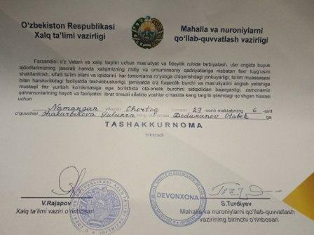 Чортоқлик иқтидорли ўқувчининг онасига Халқ таълим вазирлиги ҳамда Маҳалла ва Нуронийларни қўллаб- қувватлаш вазирлигининг ташаккурномаси топширилди