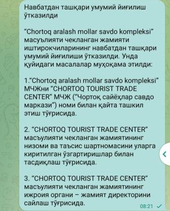 “Chortoq aralash mollar savdo kompleksi” масуълияти чекланган жамияти иштирокчиларининг навбатдан ташқари умумий йиғилиши ўтказилди. Унда қуйидаги масалалар муҳоқама этилди: