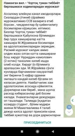 Чортоқ туман тиббиёт бирлашмаси ижтимоий тармоқларда тарқатилган материал юзасидан қуйидагиларни маълум қилади.