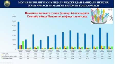 2021 йил 1 сентябр ҳолатига кўра, Молия вазирлиги ҳузуридаги Пенсия жамғармаси Наманган вилояти туман (шаҳар) бўлимлари ҳисобида турувчи жами 313 минг 523 нафар пенсия ва ижтимоий нафақа олувчилар мавжуд.